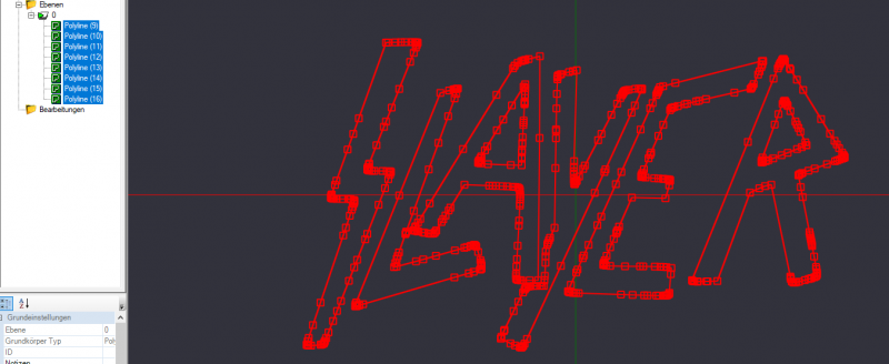 Ich hab jetzt mal deine Datei geöffnet. Das sind ja immer noch 2766 einzelne Linien. Kann man die Ecken/Rundungen nicht in echte Kreisbögen umwandeln? Das Bild zeigt das untere Ende vom "R".